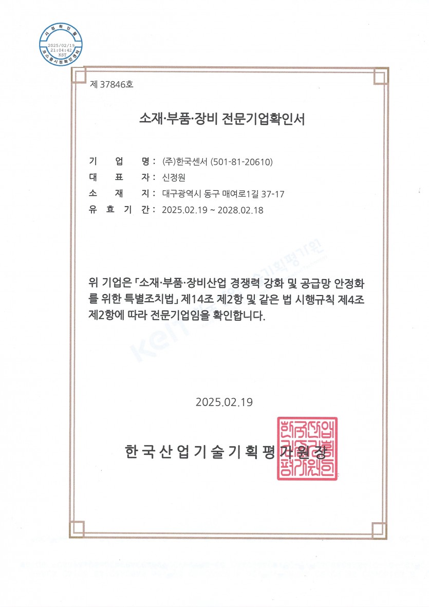 소재 · 부품전문기업확인서 페이지 정보 작성자 (주)한국센서 댓글 0건 조회 7,848회 작성일 18-04-19 11:50 본문 소재 · 부품전문기업확인서 목록 이전글 FCC 인증서 다음글 품질경영체제 인증서 댓글목록 댓글목록 등록된 댓글이 없습니다.